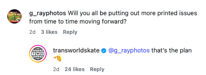 Transworld's account confirmed in the post's comments that it plans to put out the occasional print issue. The cadence of which is unclear, but it is promising either way. While I have been critical of the slop-site feed house that Transworld's web presence has become, if it's allowed them to muscle their way back into print, is that not a good thing? Ideally, they can keep it up. The issue goes on sale today at the industry's most valuable URL, skateboarding.com