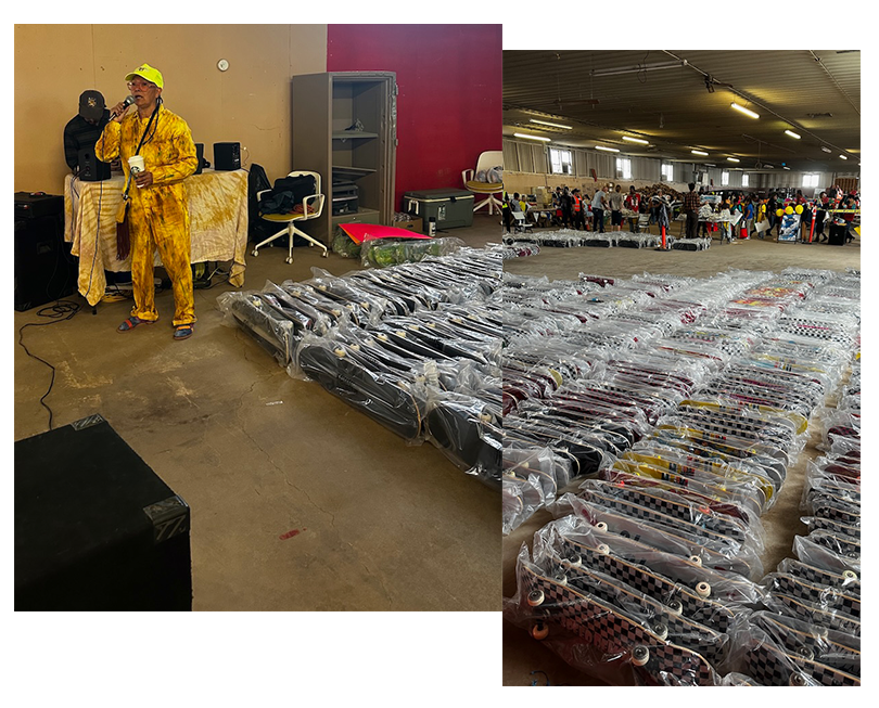 A message popped up on my screen welcoming me to Arizona. The roadside sign for the Arizona border didn’t appear for another ten minutes. A harsh confusion of winds raised dust as I drove into the fairgrounds, parked, and found a dusty convention hall busy with volunteers and forklifts. And filling about a quarter of the massive space, like some unlikely body of water, were 1,800 complete skateboards, all in plastic bags and standing on their sides. More skateboards, and by far, than I have ever seen in one place.