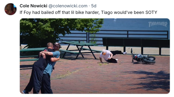 What those cycles look like now is just different, for better and worse, due to the state of the skateboarding media industry and how that media currently functions. Instead of months and months (or years) of build-up through various ads, articles, and interviews across different magazines and ur-blogs, we get marketing-adjacent mini-docs like Foy's "Out There" episode for Thrasher that came out last Wednesday. A video's cast and filmmakers will get discussed or guest on podcasts. Sponsored athletes will share what appear to be contractually obligated posts in promotion of projects they're not involved in. Productivity itself is now promotion, as both Foy and Tiago have released multiple video parts previous to Intervals in 2024. Those sections serve as a setup for the main event, leading audiences to assume that what's to come will not just be their best but their final argument for why they should win the much coveted Skater of the Year award.