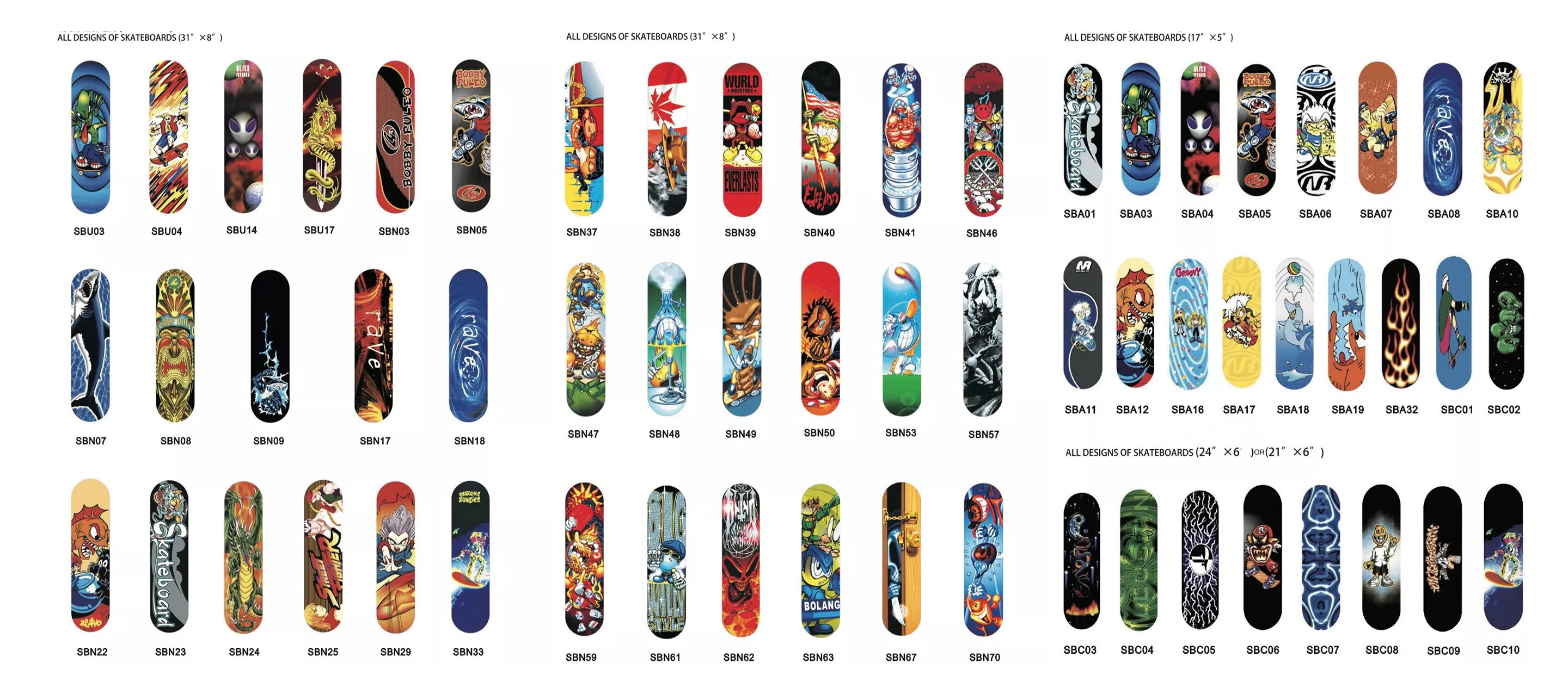 The chair and wall mount, along with the regular skateboards, all come with the option of selecting a graphic for their undersides. If you wanted a shipment of the “double rocker skateboard for adults” (minimum order of 500 units [complete skateboards]), the library of graphics to choose from is quite extensive and includes a few familiar names.
