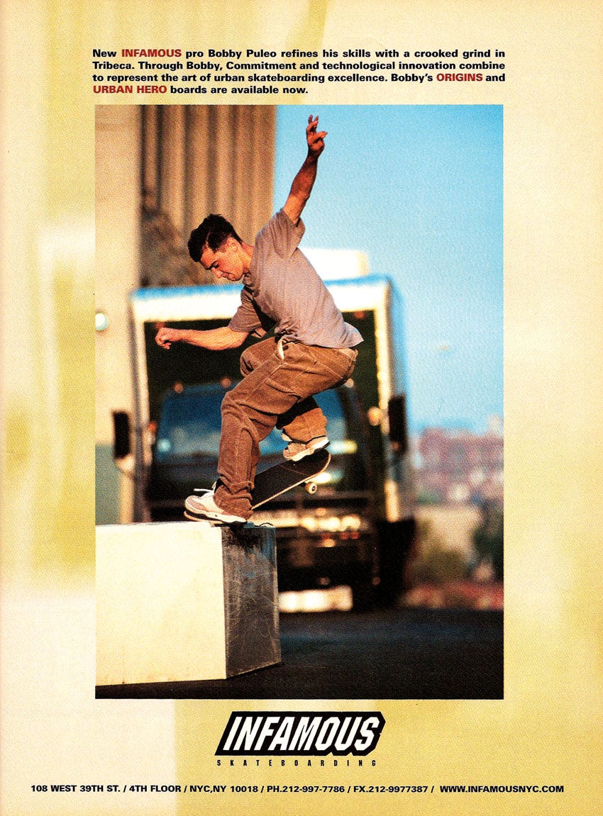 So why him? Puleo has a couple of theories. One is that when Infamous Skateboards—the New York City-based board company that he rode for from 1999 to 2001—went out of business, they “sold their backstock… probably to some toy [company] in China… [who] then just went into production with whatever was written on the boards.” Which would include the five unassuming syllables of Bobby Puleo.