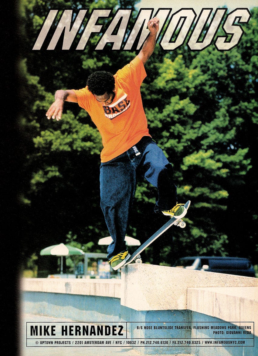 Hernandez would become disillusioned with the brand and how it was being operated. The camera-stealing incident was the tipping point, and he’d quit Infamous shortly after. He would eventually stop pursuing professional skateboarding as a career altogether and take up firefighting. He’s been with the FDNY ever since and was promoted to lieutenant in 2021. Reflecting on spending twenty years skateboarding followed by another twenty fighting fires, Hernandez laughed, “My body hurts and I’m fucking tired.”