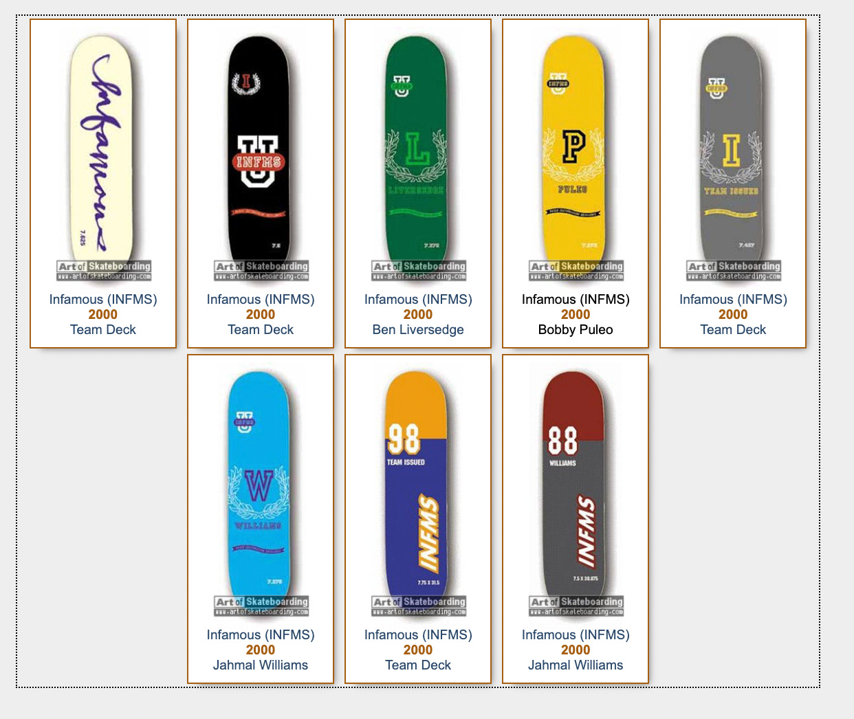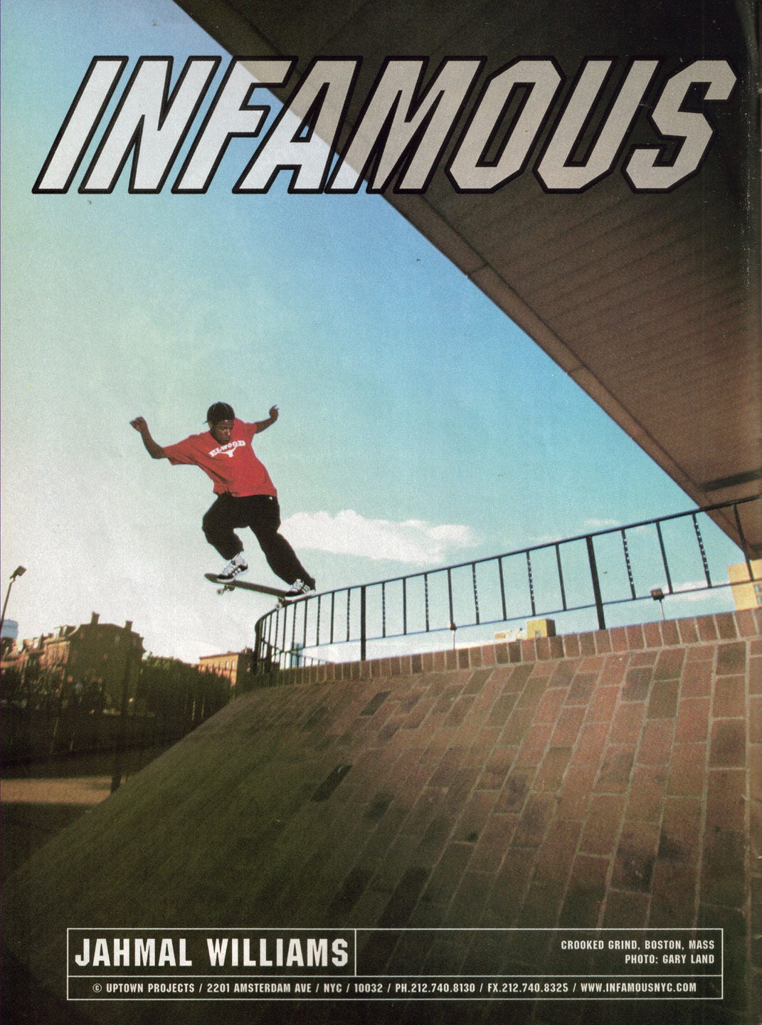 From what you can find, Infamous is usually referred to as the project of former team riders Ben Liversedge, Mike Hernandez, Ryan Hickey, and some people behind the scenes who had managed to secure financial backing for the company from Vans. They would build a team that, at different points, included the likes of Nikhil Thayer, Geo Moya, Andrew Bautista, Matt Bell, Ian Reid, Samir Krim, Jahmal Williams, and Bobby Puleo. In 2000, the company attempted its only official tour, a notorious affair that ended after only two stops and the trashing of a hotel. This would ultimately lead to nearly half of the team getting the boot. That tour is often attributed as triggering the demise of the brand.