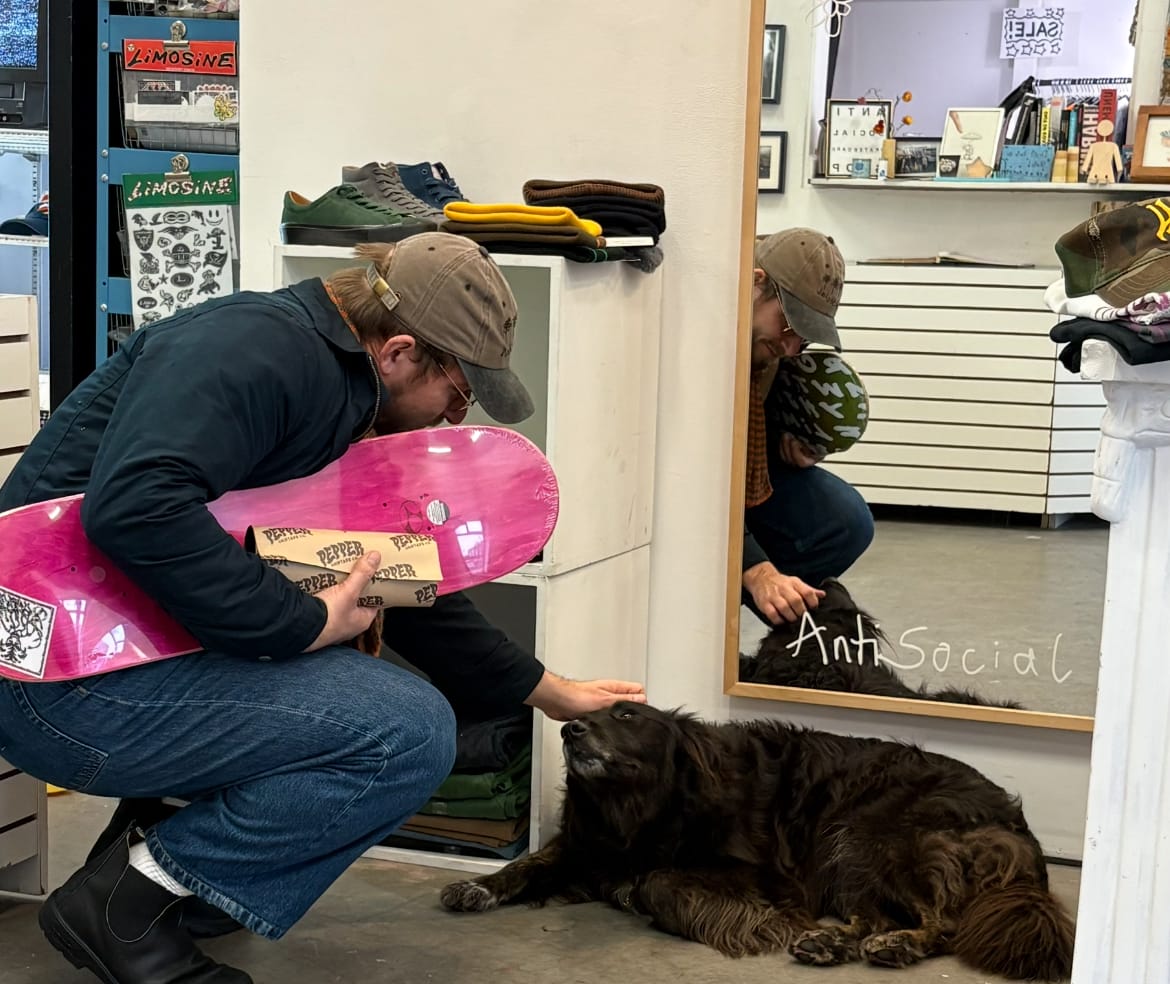 COLE: About once a week, I stop in at Antisocial here in Vancouver to say hello to whoever’s working and pet Blue, the shop dog. Those scritches behind the ear? Ritual.