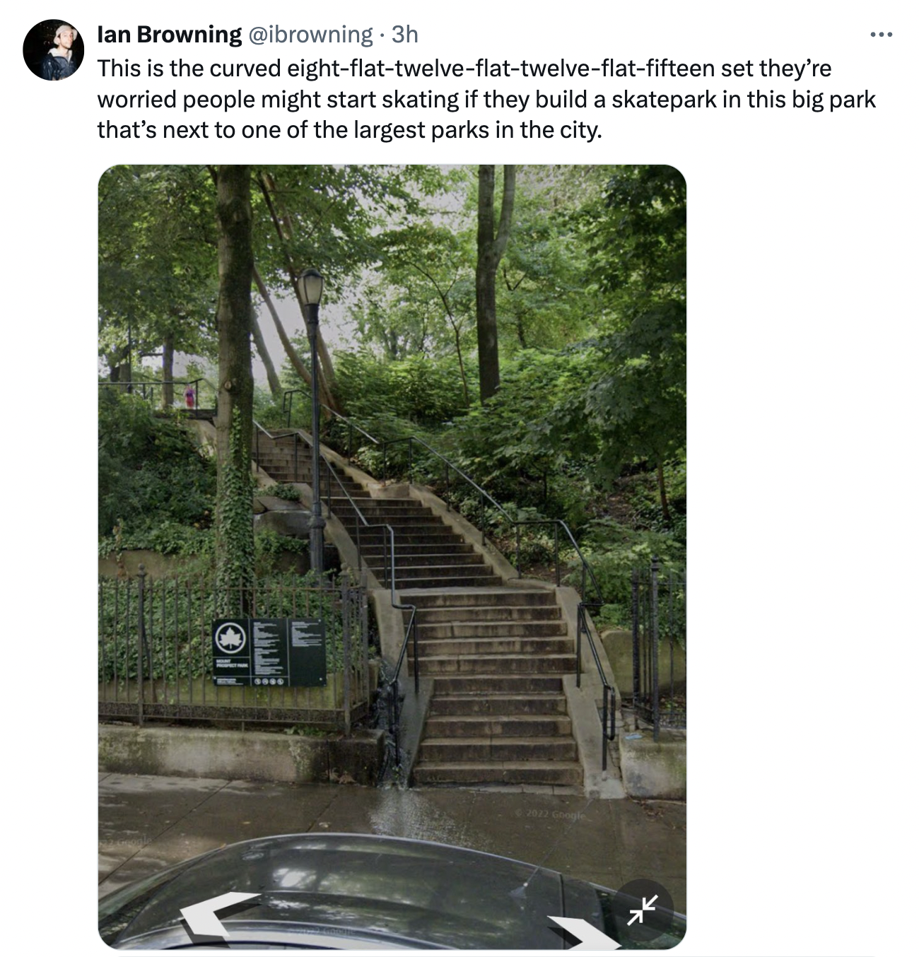Among their points of opposition is that “Pouring concrete is Stone Age,” said Hayley Gorenberg, a co-chair of the organization, citing the lack of available greenspace in the city. They also "raised questions about safety, saying that skateboarders could try their moves outside the park, creating hazards on nearby steps and access ramps. The stone steps from the highest point in the park are only one 'tempting skate challenge.'"