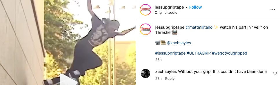 Chandler Burton recently demonstrated a next-level approach to the “sponsored post.” In it, their personality remains at the forefront, there is no deference paid to the product being promoted, and one could even consider it a subtle dig at the concept of the sponsored post itself, a thing we’ve all grown tired of by now. Yet, it’s that fun sense of self-awareness that makes it work. Fantastic execution. Get that money, Big Nakie.