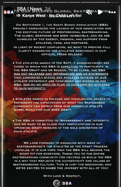 When it comes to the competitors who will fill out those teams, an SBA press release published on September 1 named 18 athletes "slated for the 2026 draft," including multiple Olympic and X Games medalists. A few days later, the SBA published a statement via Instagram Story set to Kanye West's "No Child Left Behind" with the headline "To Our Beloved Global Skateboarding Community."