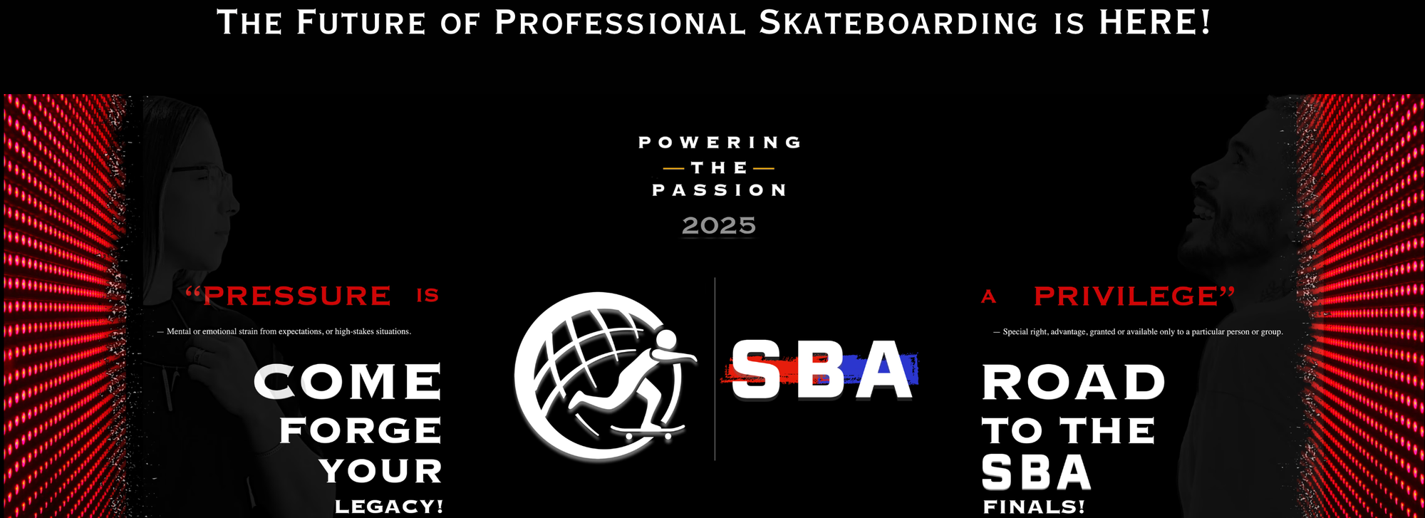 The SBA's homepage has splashed across it in big, bold type, "THE FUTURE OF PROFESSIONAL SKATEBOARDING IS HERE!" Below that reads "PRESSURE IS A PRIVILEGE" and "COME FORGE YOUR LEGACY." "POWERING THE PASSION" is thrown in for good measure.