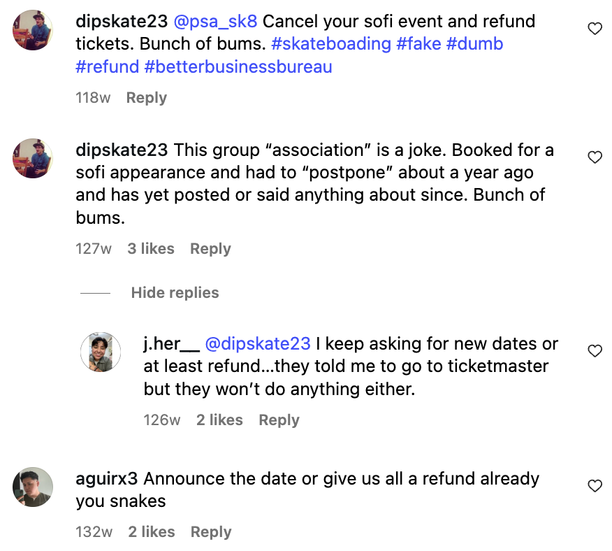 Comments on the post, made a year after the SoFi Stadium event's postponement, allege the PSA had yet to refund ticket holders.