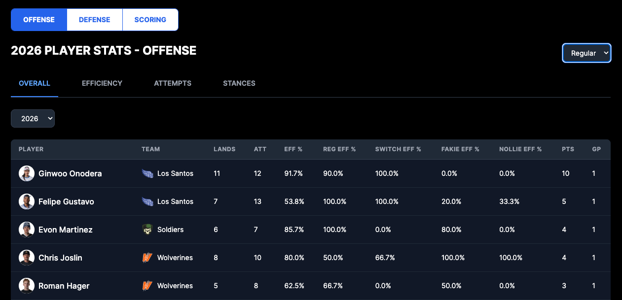 Ginwoo Onodera was the obvious MVP of the night, landing 11/12 offensive trick attempts and 7/7 on the defensive end, which is part of what I find most enjoyable about PSL so far: the stats. While the data pool is small, given that each team has only played one match, and the stat categories themselves are pretty rudimentary, I personally love this shit.