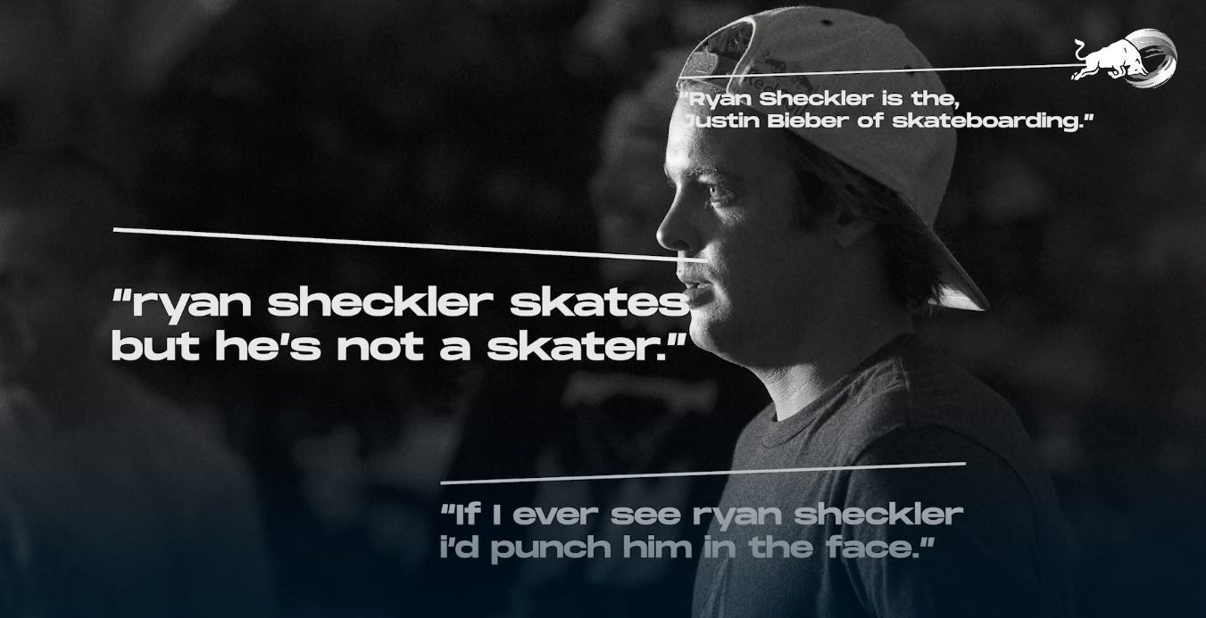 Of course, this is expected if we remember what Rolling Away is. These real, consequential human moments are just an outline in a marketing brief. The stakes surrounding them are presented but never given meaning because we need to move on, as we’ve reached the redemption arc where Sheckler sticks it to the haters by letting his skating do the talking with a pair of conveniently-branded career accomplishments that presumably earned the respect of even his harshest critics.