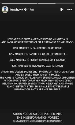 Still, online speculation ran so rampant, including a boost from the continually odious ShreddER News, that Hawk addressed it via Instagram Story on Thursday and apologized for getting Wyoming-based action sports photographer Mark Epstein "pulled into the misinformation vortex."