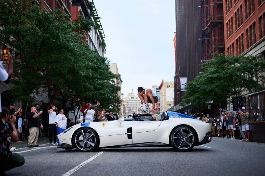 Over the weekend, two-time Thrasher Magazine Skater of The Year and small business owner, Tyshawn Jones, ollied over the Ferrari of noted record executive and artist manager Steven Victor. The car, touted as being worth five million dollars, is undoubtedly one of the more risky and expensive obstacles a person could choose to jump over with their skateboard. This leads us to the obvious question: what’s some even more expensive shit to ollie over?