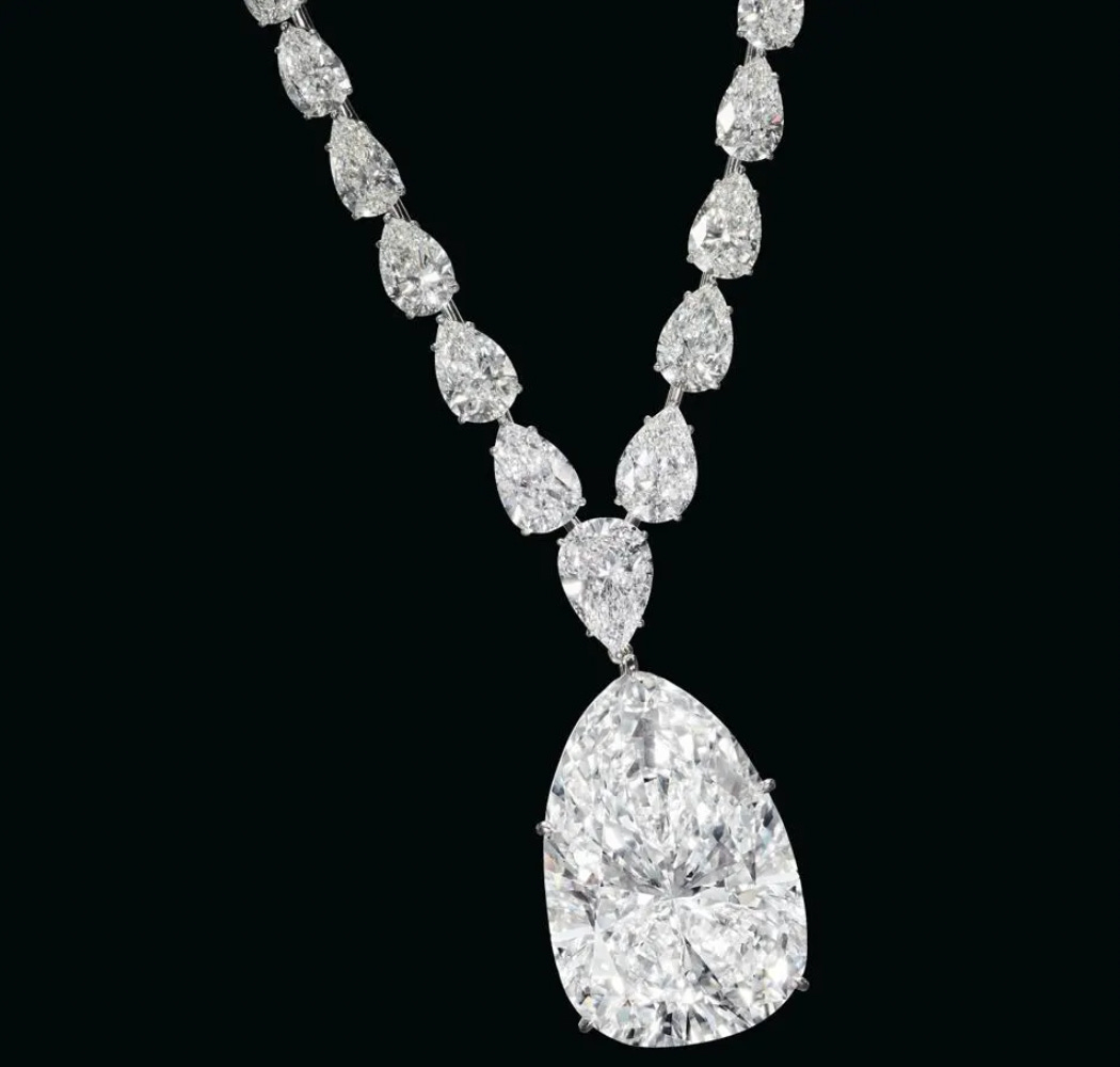 115.8-carat pear-shaped, F colour, VVS1 diamond suspended as a pendant on a necklace