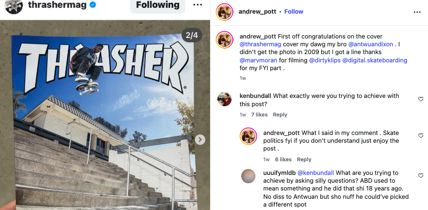 That's the thing about the skateboarding industry: Despite Pott's very legitimate talents and succeeding at making his mark in all the traditional ways expected of skateboarders at the time (including hardflipping Wallenberg), he never broke through in any serious way — no significant coverage. No magazine covers. So it's understandable that he might feel torn seeing Antwuan Dixon grace the front of Thrasher Magazine in 2026 with a switch-frontside-kickflip down the same set of stairs that he switch-frontside-kickflipped in 2009.