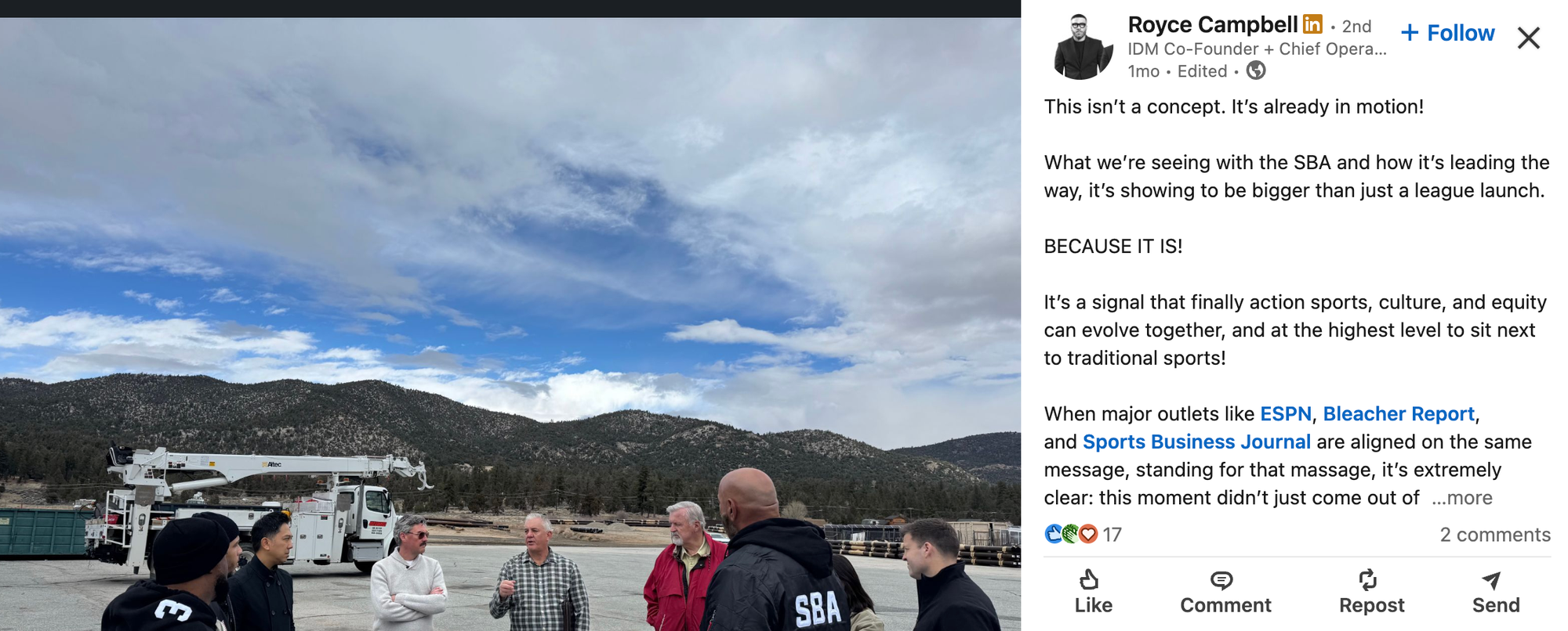Last month, Royce Campbell, co-founder of the sports and entertainment media company IDM (I Don't Miss), which is the holding company of a forthcoming competitive skateboarding league dubbed the Skate Board Association (SBA), of which Campbell is also the Chief Operating Officer, made a post on LinkedIn.