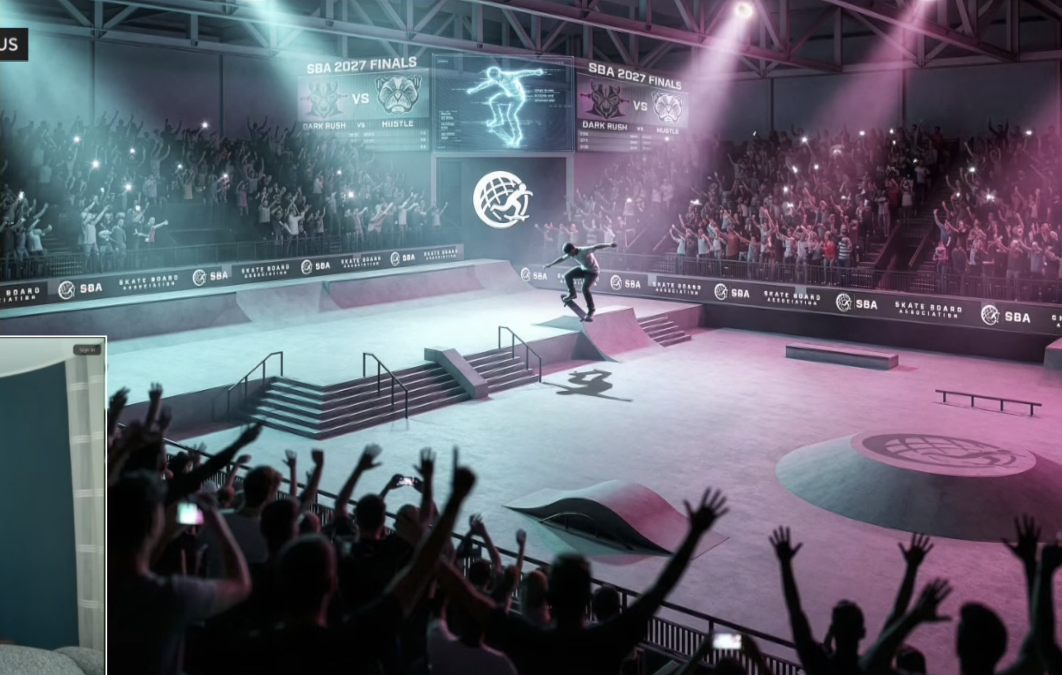 The hit features what looks to be AI-generated concept art for IDM Arena that is as low-quality and ignorant to the physical dimensions and realities of a skatepark as the half-baked background video on the SBA website.