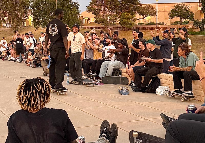 Soon, the theatre dimmed and the screen lit up. Some of the biggest stars in skateboarding flashed across it. Their names, in bold, red Impact letters, filled the screen. To have your name spelled out in that typeface carried a hard-to-quantify meaning outside of this small corner of the world. Success, sure. Proof of ability, yes. But also the supreme affirmation of belonging to one of the greatest dynastic brands in skateboarding history.