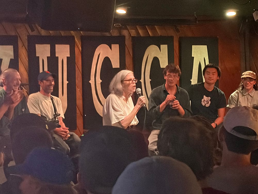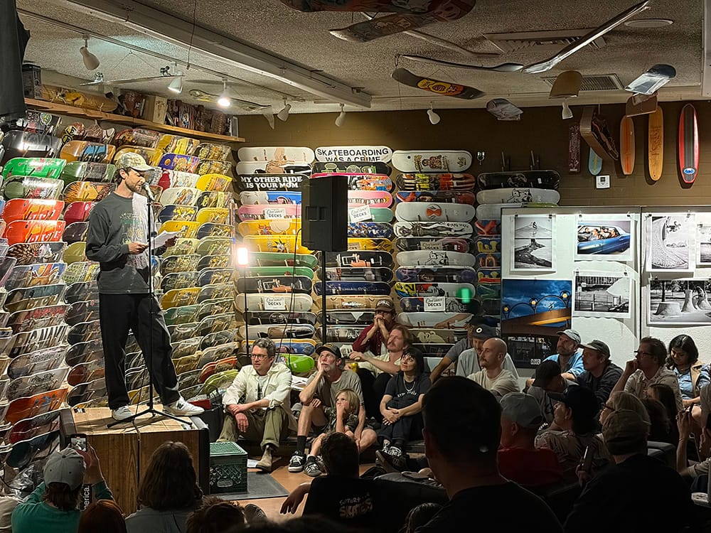 Behold, here are ten artists creating sculptures and charcoal etchings inspired by skate spots, like Alexis Sablone’s steel chair that takes after the grates at Flushing. I’d take him to the Great Skate Debate featuring Betsy Gordon of the Smithsonian, who proclaimed Archives, bitch! to a crowd full of skaters loudly reacting to either team's hot takes. We’d hit up Cowtown Skateshop for Kyle Beachy’s Anything at All reading series, and a Closer Skateboarding Magazine photo exhibit featuring the work of Jaime Owens, Norma Ibarra and Grant Brittain. We’d end the night admiring Jordan Taylor’s acting chops at the outdoor film screening of WKND skits, with Grant Yansura and PRO rider Tom K telling behind-the-scenes stories.