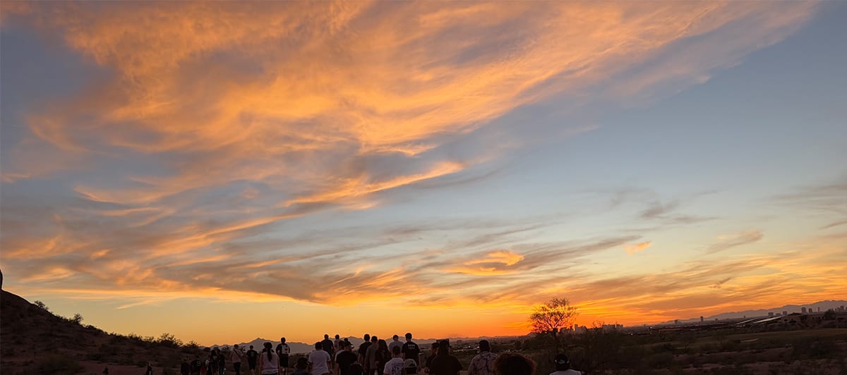 We skated, we laughed, we learned, some drank too much — and we hiked. On day two, Ryan Lay was a trail shepherd, taking dozens across the Papago Buttes. Caves in nearby bluffs became amphitheatres for hikers ready for stargazing. My body started crab walking its way to the top, following the pairs of hole-ridden skate shoes ahead of me, deliriously asking myself, How did skateboarding take us here?