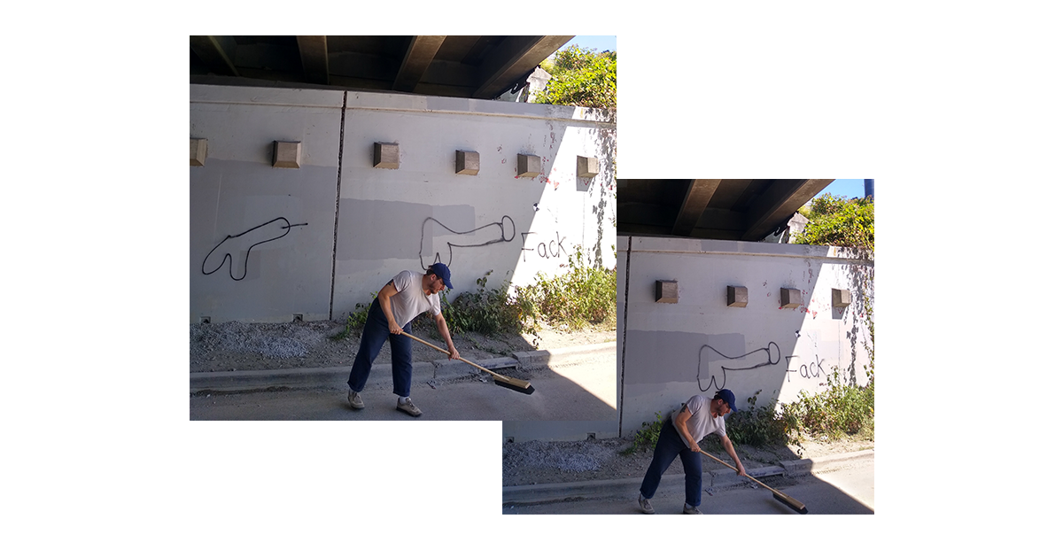 What is it? Dirt, dust, car tire rubber broken down into particulate sludge. Salt from winter road maintenance. Piss. Always piss. It hangs in the air. That’s fine. Besides being a great place to ride your skateboard, this is also the perfect place to relieve yourself. Private. Low foot traffic. Sometimes you have to square away and swallow separate truths.