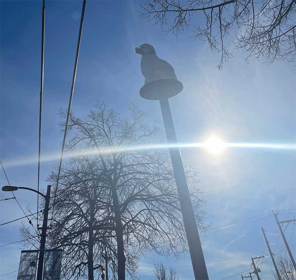 The big dog in the sky is dirty. On a pedestal 25 feet in the air, it looks blankly over the crook of Main St. and 18th Ave below. Its unblinking eyes to the north have been collecting dust and muck kicked up from southward Vancouver traffic for nearly a decade. The backside of the 7-foot aluminum poodle is pristine, as if confirming that facing the present head-on, unobstructed, day in and day out is an unhealthy proposition.